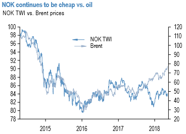 NOK valuations are still cheap with the currency still substantially lagging oil (refer 1st chart). The latest decoupling with oil has come amid deterioration in risk sentiment which we have been flagging as a risk for both Scandi currencies given that they have among the highest beta in G10 to equities.