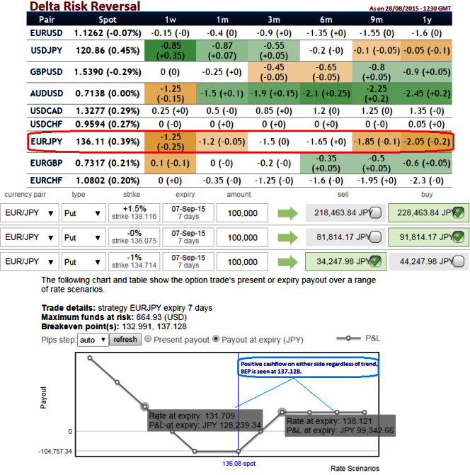 What does this strategy do with current trend: Since the short put ladder is an unrestricted return with partial risk bearing strategy that is deployed because in addition to the puzzling uptrend in short term and downtrend in long-term, we think that the EURJPY would also perceive significant volatility in the near term and delta risk reversal for next 6 months are suggesting downside hedging has been expensive due to selling pressure.