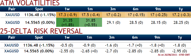 Delta risk reversal is shifted into red zone again with increased volatility. Gold was fallen to a 5.5 years low of $1,073.53 on 20th July amid the Fed's speculation of rising interest rates in September for the first time since 2006. Since then we already reiterated the prices to have rebound approximately 3%.