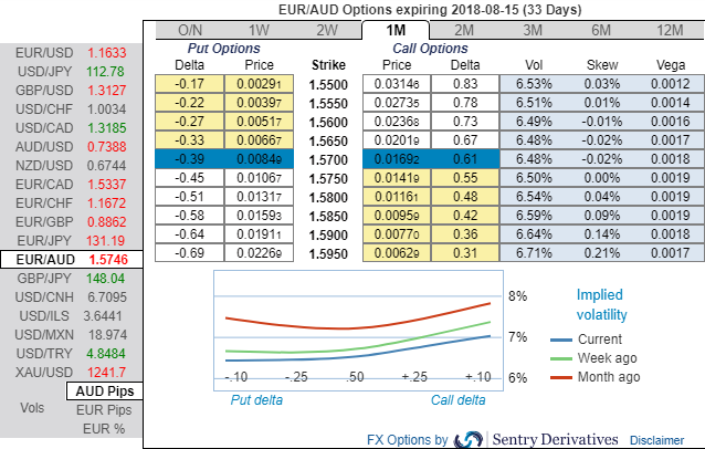 Most importantly, please be noted that IV skews of EURAUD are stretched on either side, but the positively skewed IVs of 1m tenors are signifying more hedging interests in the bullish risks. The bids for OTM puts of this tenor indicate that the underlying spot FX likely to slide upto 1.5950 levels so that OTM calls would expire in-the-money.