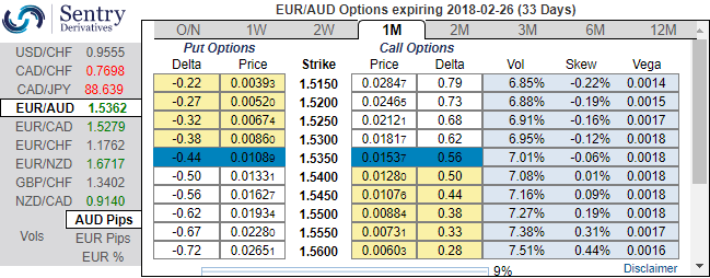 At spot reference: 1.5353, prefer a ladder to a call spread ratio as we expect slumps to continue in short run and limited spot appreciation and topside volatility, accordingly buying a 1m call ladder are recommended. Buy 1 ITM Call of 1m tenor, simultaneously stay short in 2w 1 ATM Call and Sell 1 OTM Call of positive thetas (strikes 1.5225/spot/1.5435).