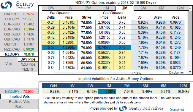 Aggressive bears can bid NZDJPY 1m IVs & RR to buy NZDJPY ATM -0.49 delta put of near-month tenors.