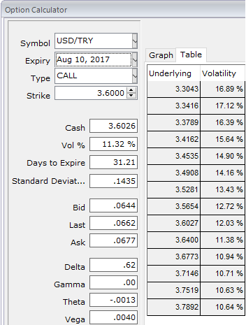Maximum returns for the straddle is achieved when the underlying USDTRY spot prices on expiry either spikes or dips dramatically.