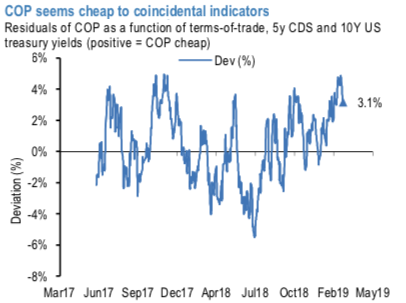 Stay long though despite some risks surfacing. The large rally in international oil prices YTD should continue to buoy COP, and we maintain that – despite COP’s strong performance - our valuation models continue to screen it as cheap. More specifically, normalized residuals of COP as a function of terms-of-trade, 10-year treasury yields, and the 5-year CDS, are showing the peso as 2.8% cheap (1.2 sigma, refer above chart).