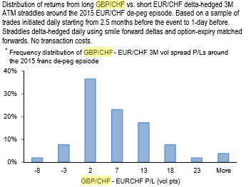 The above chart demonstrates that GBPCHF - EURCHF vol spread returns are reasonably well insulated to SNB shenanigans: the P/L distribution of such trades initiated in the weeks before the 2015 franc de-peg has a positive mean (2 vol pts.) and appreciable positive skewness.
