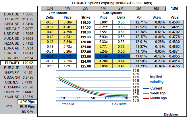 Trade risks: unlimited below 123.1715. The structure is buying a standard call spread strikes 121.1217/125 fully financed by selling a put strike 123.1715. As such, investors face unlimited downside risk at the expiry if EURJPY trades below 123.1715.