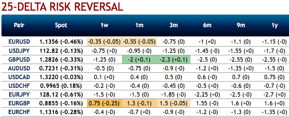 Risk reversals:Most importantly, to substantiate the downside risk sentiments as stated above, we see bearish neutral risk reversal numbers of EURJPY across all tenors that indicate bearish risks remain intact in the long run. While shrinking IVs that are on lower side, is interpreted as conducive for put option writers.