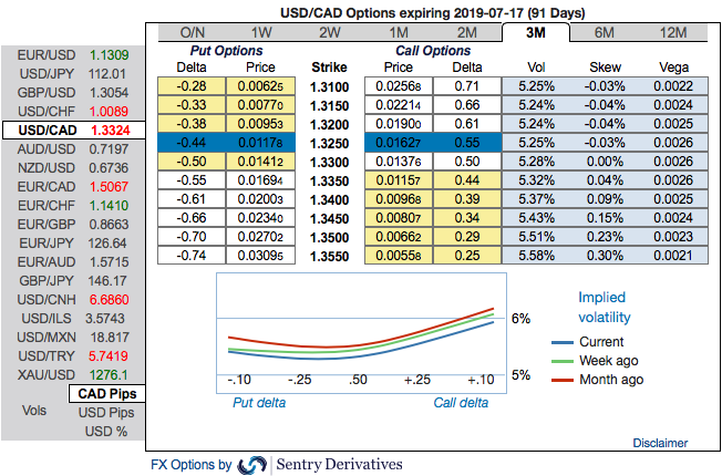 At spot reference: 1.3324 levels, we execute USDCAD 3m/1m call spread with strikes of 1.36/1.32 for a net debit.