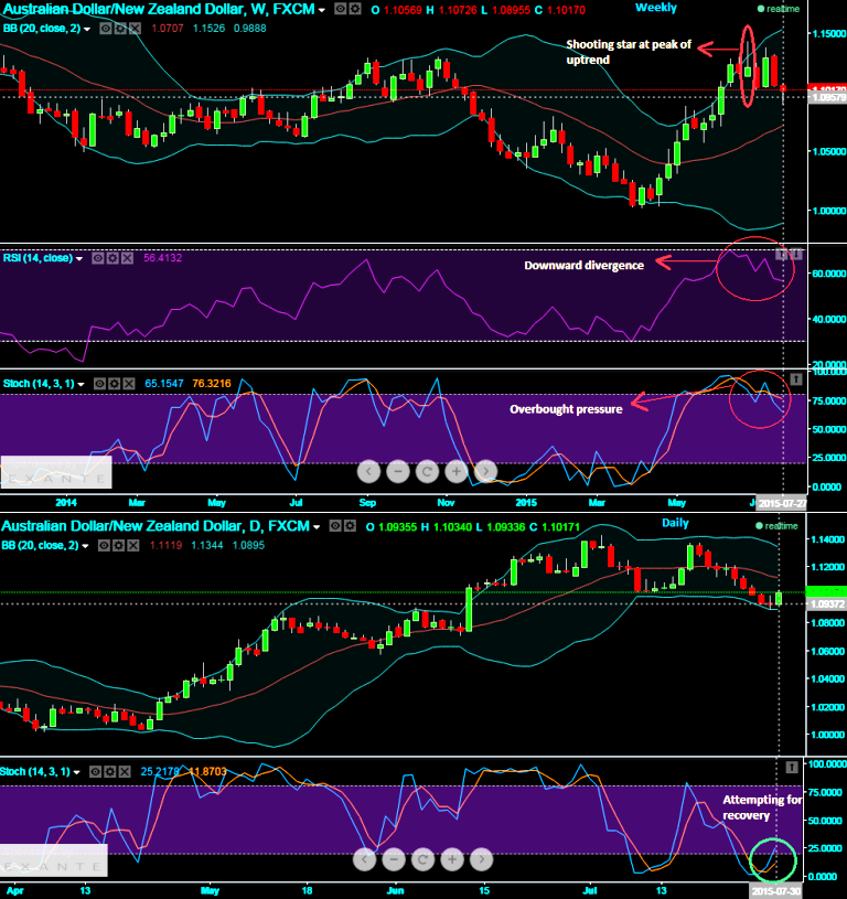 Ever since the downswings are seen on this pair the leading oscillators have been showing downward divergence. RSI trending near 56.6008 diverging with falling prices, while %D line crossover on slow stochastic at around 80 levels signifies selling momentum is continuing. Currently, %D line trending at 76.5986 while %K line at 66.0365 to signify overbought pressure. But as it is sensed that all chances of NZD may look superior over AUD in medium term future, we advise to hedge the Aussie dollar's depreciation through below recommendations.