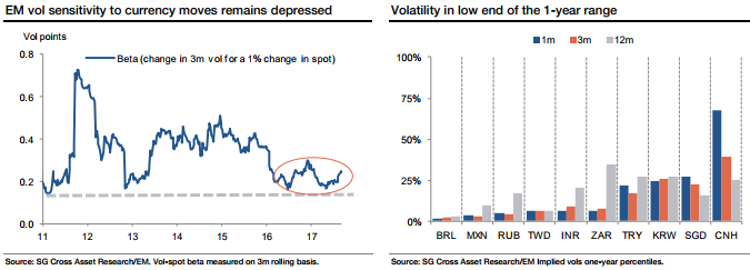 Vol and skew beta: The sensitivity of average EM implied vol and risk reversals to changes in underlying spot rates remains depressed near five-year lows (exception being BRL).