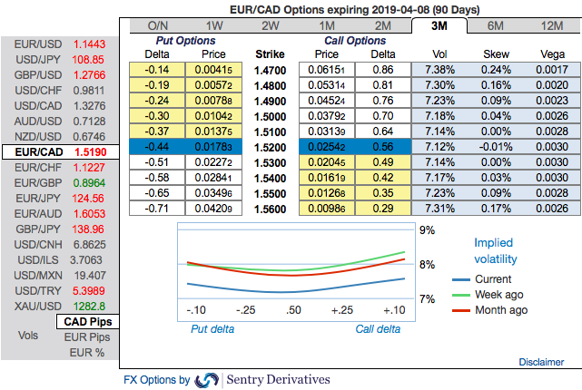 The Execution of Options Strategy: At spot reference: 1.5202, contemplating above driving forces and OTC indications, we reshuffle our previous strategy by advocating initiating longs in 3M EURCAD at the money -0.49 delta put, and go long in at the money +0.51 delta call of similar expiry and simultaneously, short 2w (1%) out of the money calls. Thereby, we favor slightly on upside risks as short leg likely to reduce long legs. Courtesy: Scotiabank, Sentrix