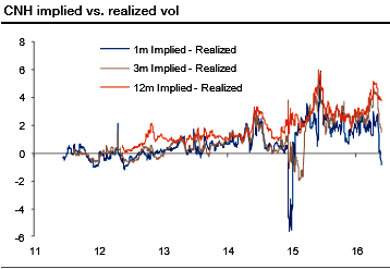 CNH premium over CNY is 50bp (i.e. USDCNH is 50bp lower than USDCNY), while CNH vol is only slightly higher than CNY (0.2-0.3 vol points).