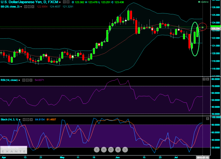 On EOD charts, the formation of four priced doji candlestick pattern occurred at 123.382 levels that reflects the highest extent of indecision between bulls and bears as there was also 3 white soldier pattern occurred before.