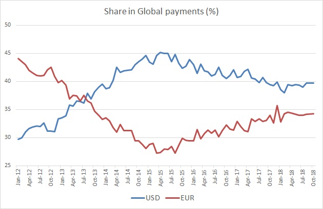 According to latest data, the U.S. dollar was used to make 39.7 percent of the global payments, higher than its January bottom around 38.5 percent, and still higher than the euro, which enjoys 34.2 percent share. Euro remains the closes in challenging dollar’s dominant position, whereas other currencies remain far off. Any forecasts suggesting that the Chinese yuan would replace the USD as the global reserve currency and the preferred currency in global payments is highly likely to be incorrect at least in the medium term, as the Chinese yuan only enjoys 1.7 percent market share in global payments.