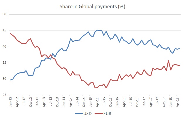 The dollar is likely to lose its number one position in the global payments as SWIFT data suggests that the spread gap between payments in euro and USD declined to the lowest in more than five years. As global geopolitical frictions rise between the United States and the rest of the world, SWIFT data shows that dollar’s share in global payments is in decline.