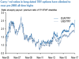USDTRY 1Y ATM vol is up 1.5 % pts. over this period which represents an undershoot of the typical spot-vol linkage to the tune of 1% pt., while 1Y 25D risk-reversals are barely changed and were barely profitable if purchased and delta-hedged since early September before the US/Turkey visa spat erupted.