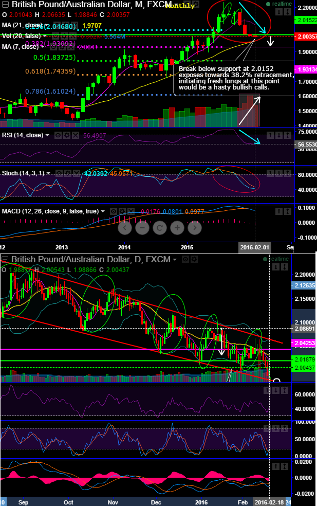 After the ruthless slumps form the peaks of 2.2372, the pair has broken a support at 2.0152, it is on the verge of next medium term support at 1.9747 and at 1.9313 levels which 38.2% retracements during Q2 as sterling worsening and losing its strength against Aussie dollar.