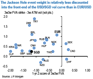 Judging whether the Jackson Hole event weight is excessive for a single currency is tricky, but it is easier to identify vol curves where this risk premium is underpriced relative to EURUSD. Using the slope of the 3-wk/6-wk ATM (pre-Jackson Hole vs. post ECB/Fed) curve as a proxy for the event risk premium, USDSGD stands out as an underpriced candidate that has tracked EURUSD with 60% correlation in spot returns over the past month –not surprising given the ~13% JPM-estimated weight of EUR in the SGD basket - and where forward vol is both low on levels and almost flat to spot ATM (refer above chart).