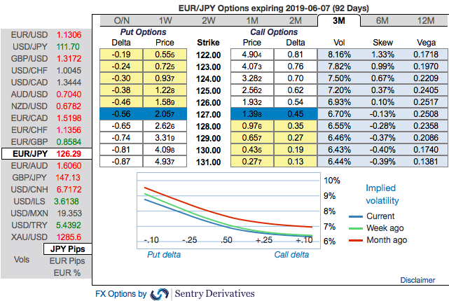 Hedging skewness: Let’s quickly glance at the positively skewed IVs of 3m tenors that are signifying the hedging interests for the bearish risks. The bids for OTM puts of these tenors expect that the underlying spot FX likely to break below 122.50 levels so that OTM instruments would expire in-the-money.