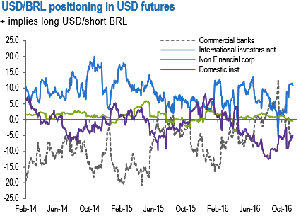 Firstly, positioning has improved (refer above diagram). International investors’ long USD positioning is close to YTD highs in the futures, while local institutional investors also scaled back long BRL.