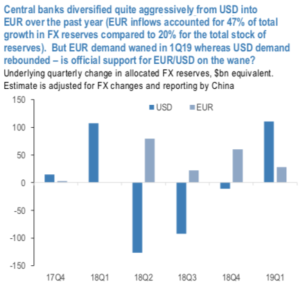 ECB has continued to maintain status quo in its yesterday’s monetary policy. The European central bank is no longer as passive about the economy and lack of progress on inflation as it was before Draghi’s activist Sintra speech. The ECB’s increased urgency to act could help to restore the missing link between economic performance and the currency, to the detriment of EUR. 2) Central bank demand for EUR could well be moderating and USD demand on the increase again, to judge from the IMF's 1Q’19 COFER data on reserve allocations (refer 1st chart).