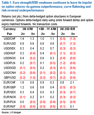 While JP Morgan ponders that the powerful beta-forces of Euro strength and dollar weakness continued to leave their imprint on FX vol surfaces for another week. Gamma continued to outperform, led this time around by the outsized 2.5% w/w move in USDCHF, vol curves remained under flattening pressure and the recent trend of risk-reversals reshaping away from USD calls in favor USD puts stayed intact following a dovish-leaning FOMC statement (refer table).
