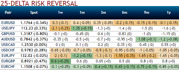 Most importantly, just glance through above nutshell evidencing the negative shift in risk reversals but with positive numbers that indicate the hedging sentiments for the upside risks. While positively skewed IVs signify hedging sentiments for the bullish risks.