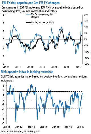 First, our EM FX risk appetite index looks increasingly stretched. The above charts show that the EM FX risk appetite index, based on a number of risk, flow and positioning metrics, is heading towards stretched levels. Historically, changes in this index have co-moved closely with EM FX. Admittedly, we have underestimated the extent to which risk appetite would recover from the lows in December, and have successively closed bearish EM FX positions (taking profits on TRY, and being stopped out of long USDRUB) in response.