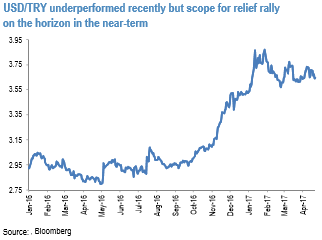 Judging from recent comments by the Turkish officials, early elections this year are very unlikely and therefore the political risk calendar for the remainder of the year is light. With the weight of political uncertainty no longer bearing down on Turkish lira assets, we think there is scope for a relief rally in the currency over the short run given its significant underperformance in recent months (refer above figure).