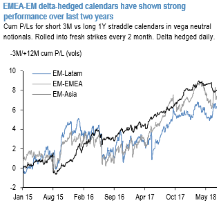 Within EM, EM Asia has been the most consistent outperformer but EM-EMEA also have shown strong average with an overall Sharpe ratio of 0.7 for short 3M/long 12M delta hedged straddles over the last 3-years.