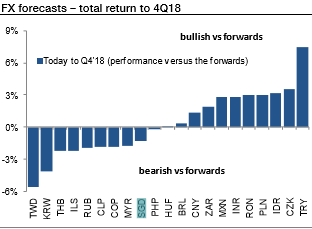 Against the forwards, the forecasts have been the most bearish on the TWD, KRW, THB, RUB & SGD and the most bullish on the TRY, CZK & PLN. On a regional basis, EMEA should outperform. We could foresee slightly more EM Asian FX weakness than consensus, but there have been exceptions.