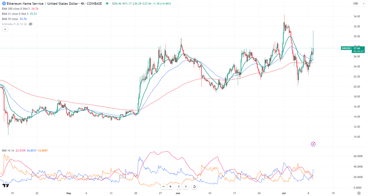 ENSUSD gained more than 50% in the past three days. The pair holds well above the short-term (21 and 55 EMA) and long-term moving average. It hit a high of $31.17 and is currently trading around $27.73.