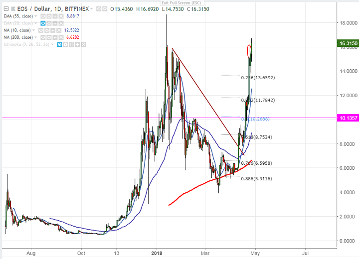 - EOS/USD has continued its bullish trend after a three days of consolidation. The pair hits low of $13.37 and shown a major jump of almost more than $3 from that level. The pair hits fresh 4 month high at $16.69.It has recovered more than 300% from temporary bottom of $3.8700 and is currently trading around $14.35.