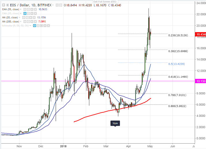 - EOS/USD has recovered almost more than 20% after hitting low of $15.91. The pair hits life time high of $23.02 on Apr 29th 2018 and shown a minor profit booking. It has recovered more than 450% from temporary bottom of $3.8700 and is currently trading around $18.45.