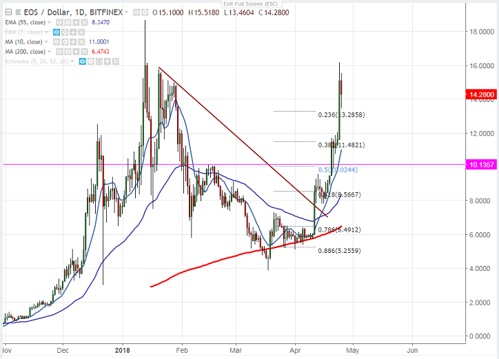 - EOS/USD has shown a minor 17% profit booking after a jumping more than 50% in previous week after hitting low of 7.80 level. The pair has broken major resistance $15.75 high made 4 months before and jumped till $16.17.It has recovered more than 300% from temporary bottom of $3.8700 and is currently trading around $14.20.