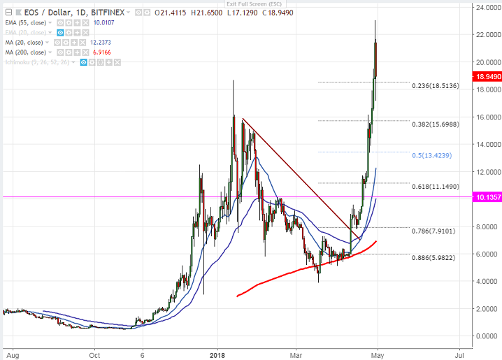 - EOS/USD has declined almost 25% after hitting fresh life time high $23.02. The pair hits low of $17.12 and shown a major jump of almost more than $2 from that level. It has recovered more than 450% from temporary bottom of $3.8700 and is currently trading around $18.86.