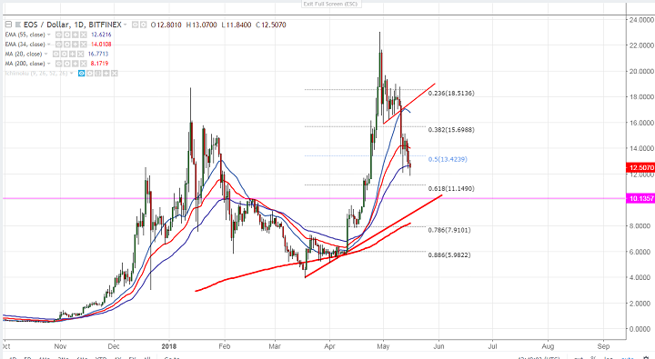 - EOS/USD has lost more than 15% in the past 24 hour from high of $14.40 level. It hits low of $11.84 almost 48% on May 16th 2018 from the all-time high of $23.02. EOS has released EOS Dawn 3.0 in form of test net and EOS Dawn 4.0 released on May 11th. EOS main net is scheduled to go live in 40 days and big exchanges like Bitfinex, Huobi and eToro has extended their support for EOS. The pair declined sharply almost more than 30% after in previous week after news of UpBit involvement of fraud. UpBit is the largest market for crypto currency EOS accounting for 13% of all trades. It is currently trading around $12.46.