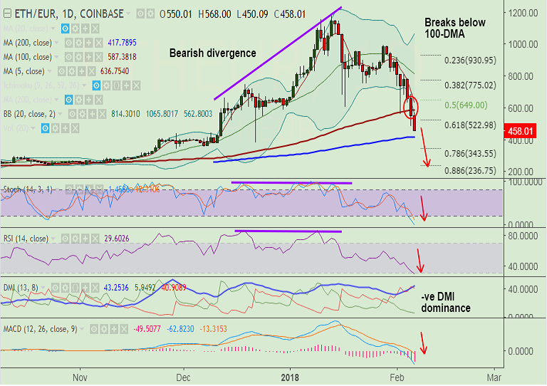 - ETH/EUR closes below 100-DMA support at 585 levels, bias still bearish.