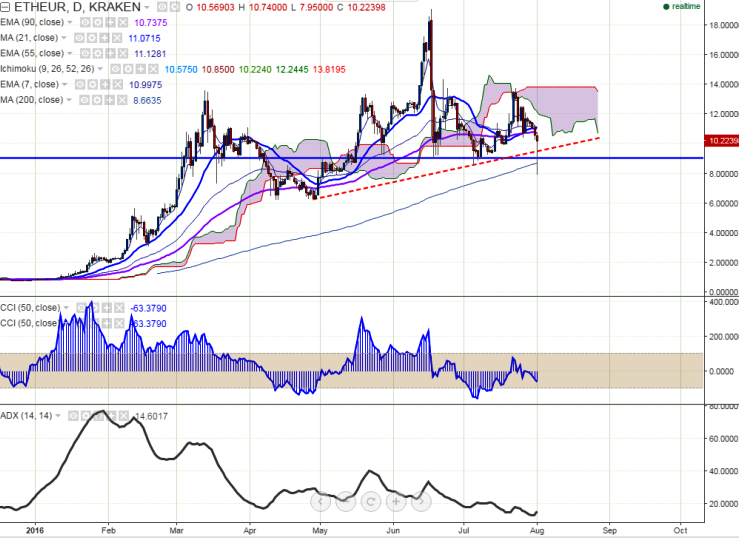 Long-term trend remains to be bullish. In a daily chart, ETH/EUR is facing strong support at 8.61. So the pair should close below 8.60 for further weakness till 6.30. The pair has recovered till 10.74 (90 days EMA) and any slight bullishness can be seen only above that level.