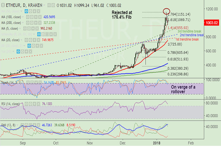 - ETH/EUR is extending downside from 1150 levels, currently hovers around 1000 mark after hitting session lows at 961.