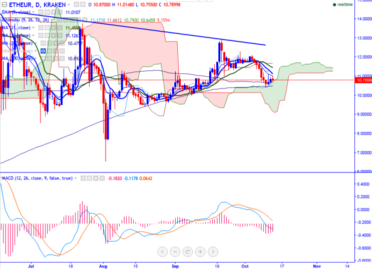 ETH/EUR is seen trading below in red on Thursday. The pair has retreated sharply after jumping till 11.01 levels (KRAKEN). It is currently trading around 10.755 at the time of writing.