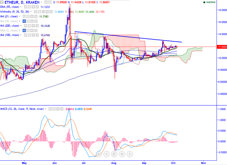 ETH/EUR is seen trading below in red on Wednesday. The pair has once again retreated after jumping slightly above 12 level (KRAKEN). It is currently trading around 11.86 at the time of writing.