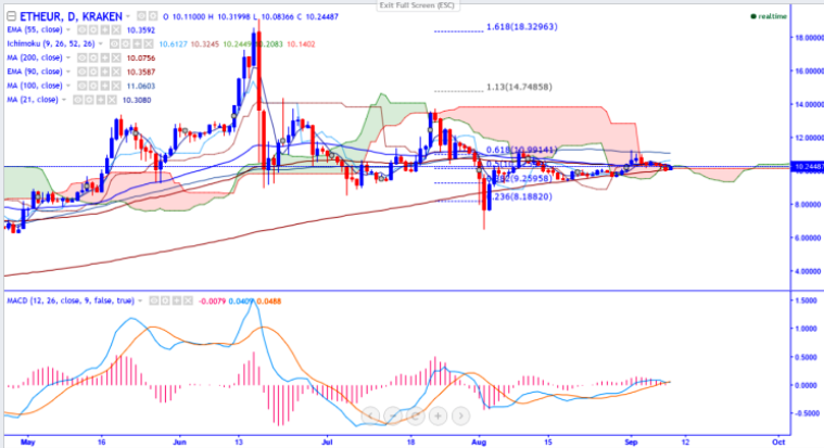 ETH/EUR is seen facing a strong support on Friday. The pair has slightly recovered after making a low of 9.970 levels (KRAKEN). It is currently trading around 10.24 at the time of writing.