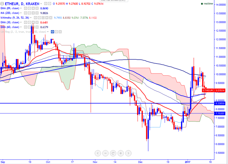 ETH/EUR is seen trading below in red on Friday. The pair has jumped slightly after declining till 8.640 levels (KRAKEN) yesterday. It is currently trading at 9.10 at the time of writing.