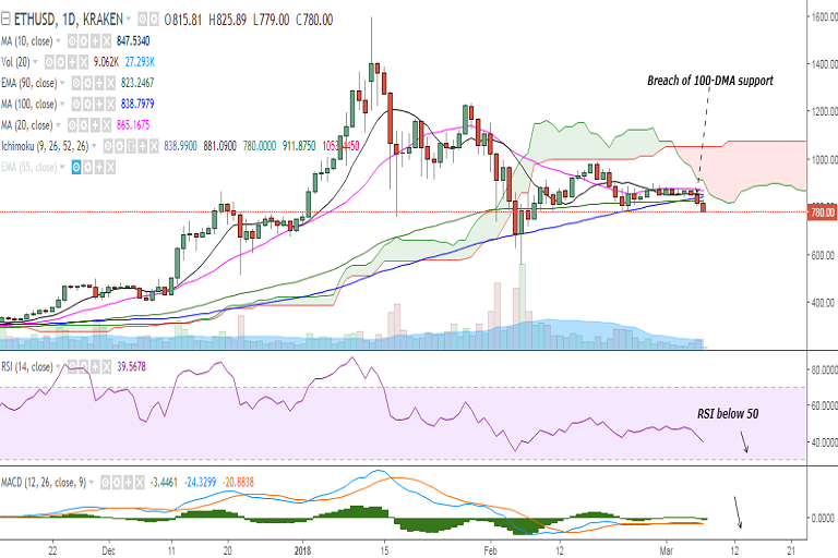 ETH/USD is trading lower on Wednesday as it broke below 100-DMA support. It is currently trading at 781 levels at the time of writing (Kraken).