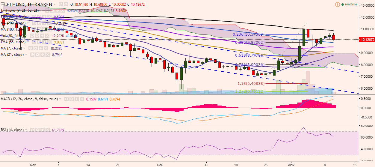 ETH/USD is facing strong resistance from 200-DMA and is currently trading at 10.11 levels at the time of writing (Kraken).