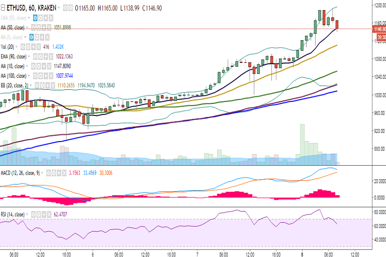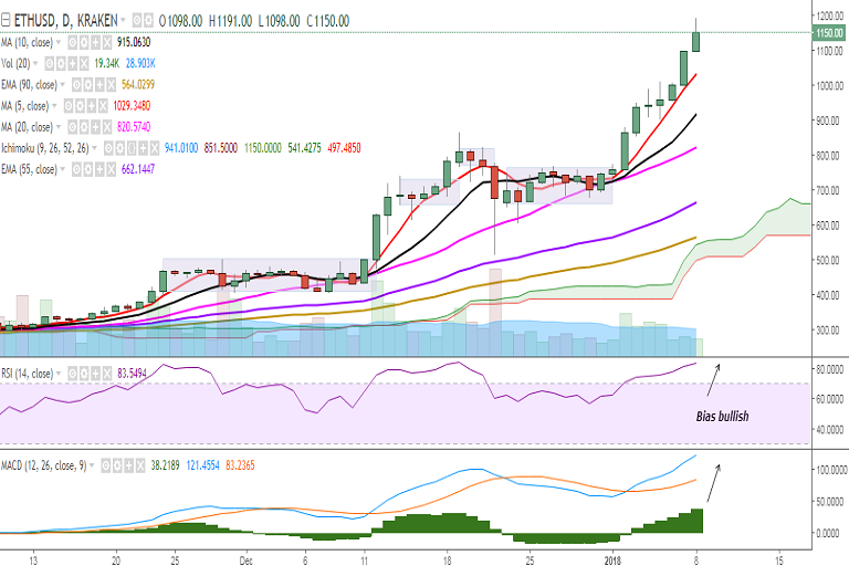ETH/USD is continuing its upward trend on Monday and has hit a fresh all-time high at 1191 levels so far in the day. It is currently trading at 1150 levels at the time of writing (Kraken).