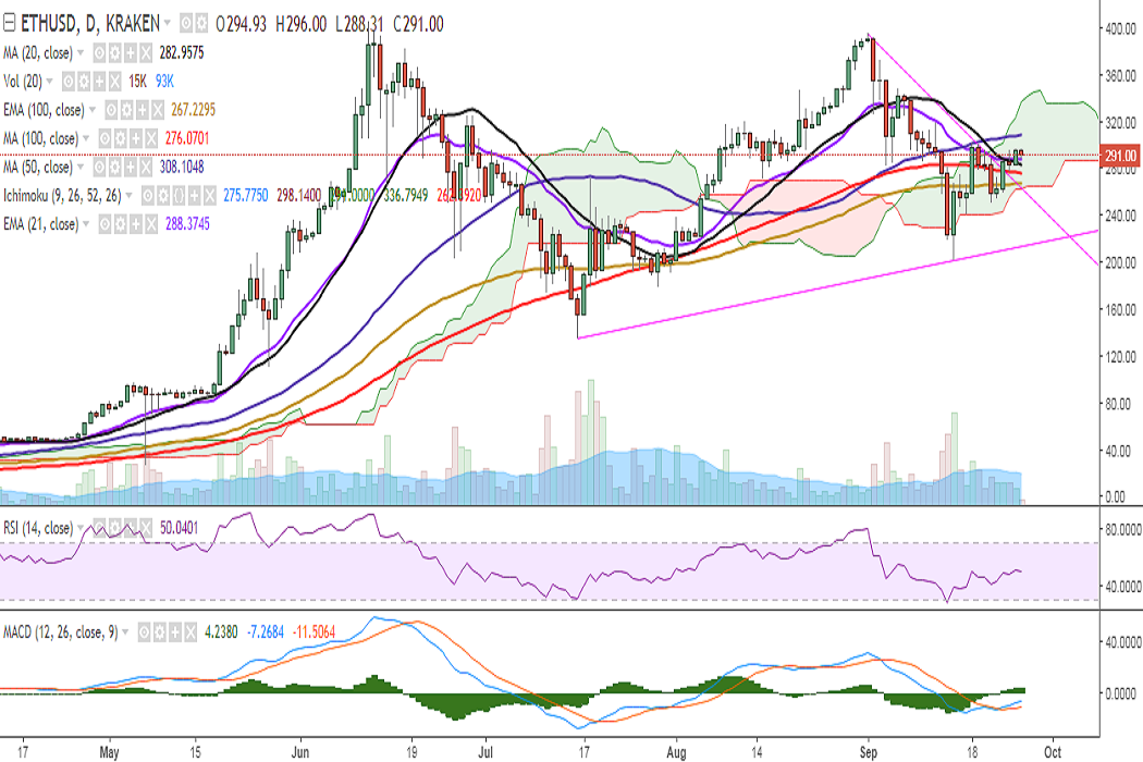 ETH/USD is facing strong resistance at 300 levels and is currently trading at 292 levels at the time of writing (Kraken).