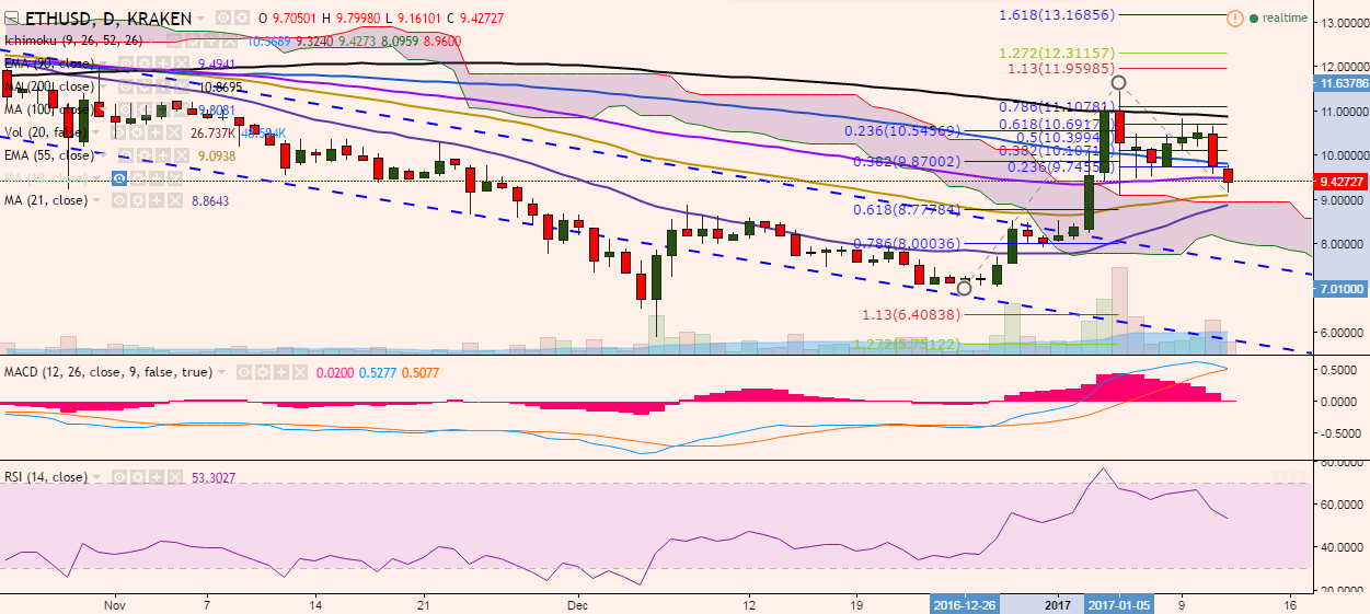 ETH/USD failed to hold its strength above 90 EMA and moved further south on Thursday. It is currently trading at 9.25 levels (Kraken).