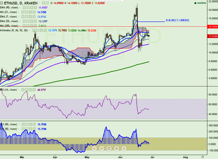 ETH/USD is trading in narrow range between $15.10 and $13.70 for the past two trading session. It is currently trading at $13.82 (Kraken).